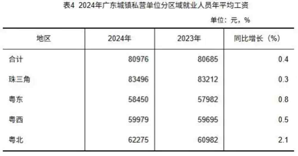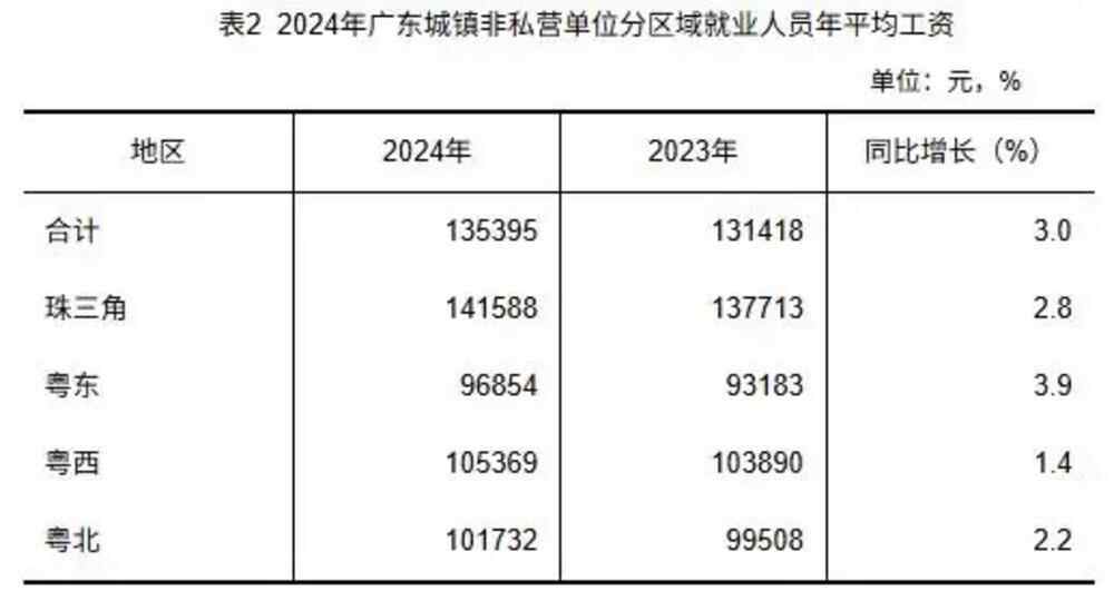 此外,广东省统计局发布了2024年广东平均工资数据。2024年广东城镇非私营单位就业人员年平均工资135395元,同比增长3.0%,其中,在岗职工年平均工资137468元,增长3.0%。广东城镇私营单位就业人员年平均工资80976元,同比增长0.4%。