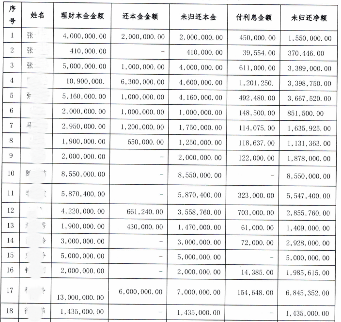 席薇案涉及的部分客户被骗理财款项明细。截至案发时,共有9000余万未返还被害人。 法院判决书截图