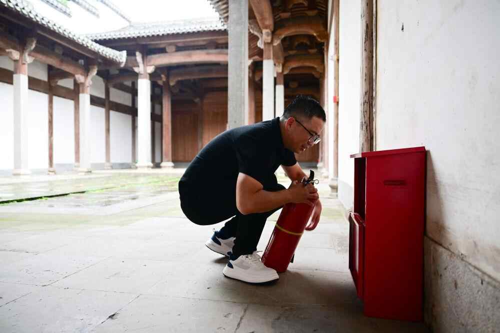 6月19日,周虎在歙县一个祠堂内检查灭火器。
