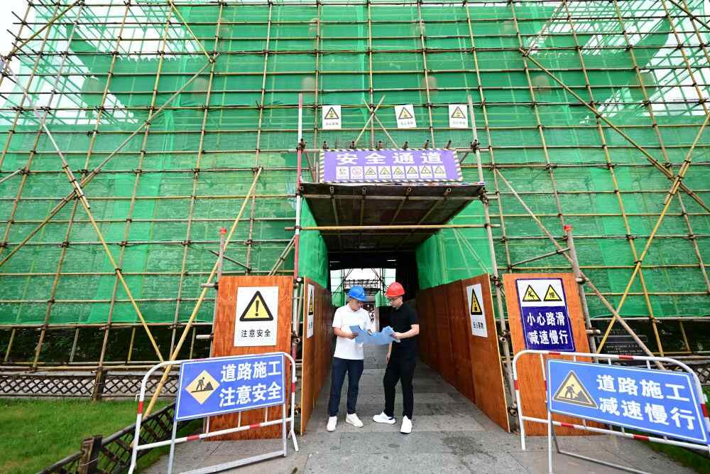 6月19日,周虎在歙县徽州古城南谯楼保养维护工程现场查看。