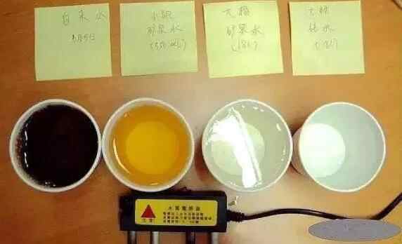 商家把测试仪放入两杯同样清澈的水中,经过几十秒的电解后,其中一杯过滤后的水呈无色,而另一杯中的自来水由黄色变绿色,最后表面浮有一层褐色的膜。