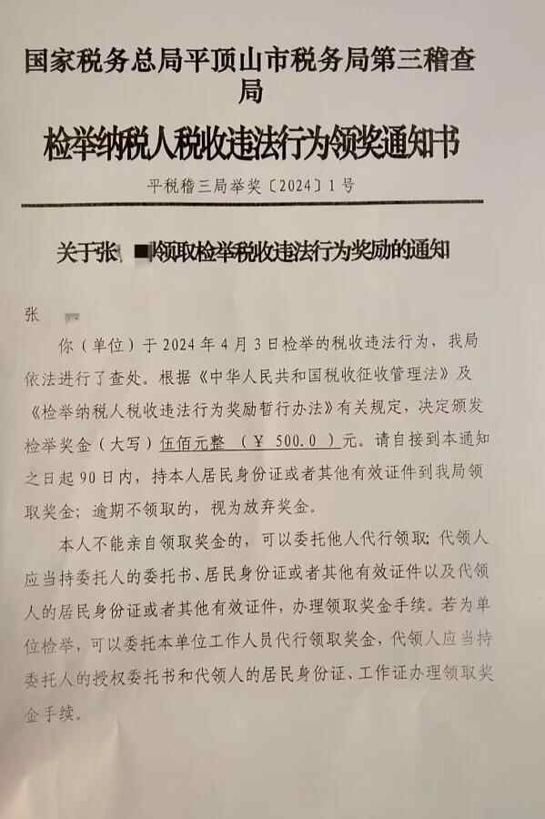 张先生提供的一份平顶山市税务局第三稽查局出具的《税务检查通知书》显示,该局通知河滨公园,自2024年4月17日起,对该公园2021年1月1日至2023年12月31日期间涉税情况进行检查。同年12月,张先生收到了该局出具的《检举纳税人税收违法行为领奖通知书》,文中称,张先生于2024年4月3日检举的税收违法行为,该局依法进行了查处,根据相关规定,决定颁发检举奖金500元。