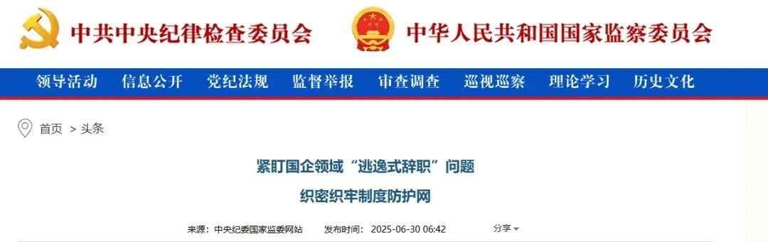 6月30日,中央纪委国家监委网站发文《紧盯国企领域“逃逸式辞职”问题 织密织牢制度防护网》,内容如下:
