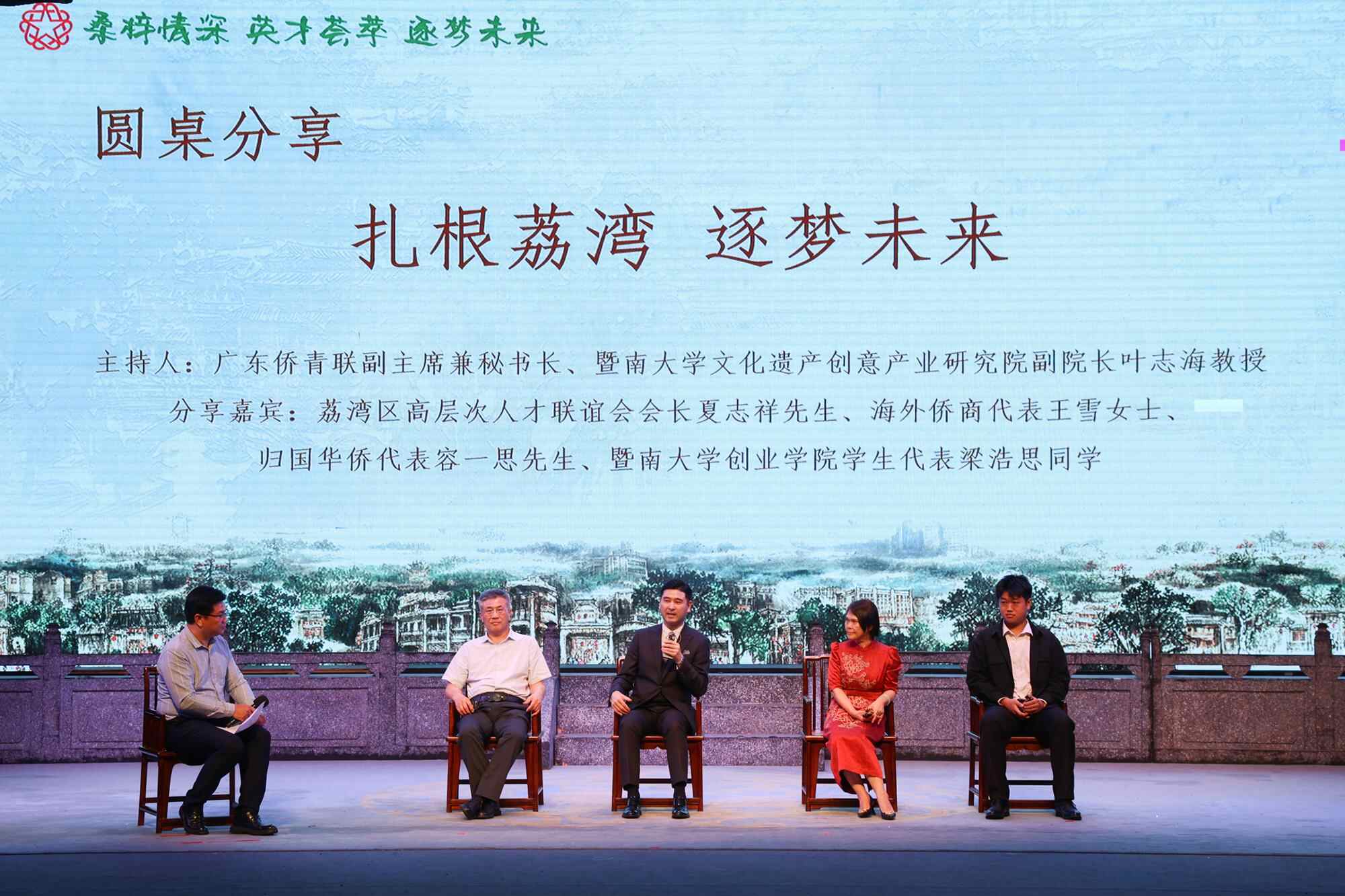 在圆桌分享会上,广东侨青联副主席兼秘书长、暨南大学文化遗产创意产业研究院副院长叶志海,荔湾区高层次人才联谊会会长夏志祥,海外侨商代表王雪,归国华侨代表容一思,与暨南大学创业学院学生代表梁浩思展开主题交流,从不同维度分享他们的见解,给新侨人才创新创业带来更多启发和灵感。