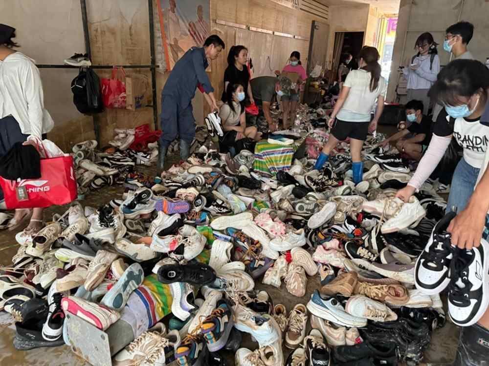 龙女士向九派新闻介绍,其丈夫在常驰广场经营两家安踏店和一家李宁店,上万件库存被淹,损失超过200万元。安踏李宁的鞋,原价300元至800元一双不等,现处理价100元。来店里光顾的多是老顾客,“肯定回不了本,只能卖一点是一点,尽量减少损失”。