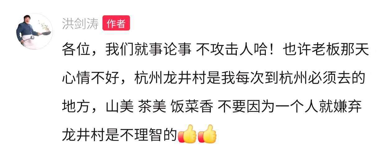 视频给多位店家相关人员面部做了马赛克处理,但视频仍然引发众多网民关注。6月30日上午,大皖新闻记者看到,洪剑涛账号发布的该条视频已经获得超过12万点赞,评论区不少网民发布了店家门牌的截图,还有网民找出了店家的相关社交平台账号。洪剑涛两天前在视频评论区回复称,“各位,我们就事论事不攻击人哈!也许老板那天心情不好,杭州龙井村是我每次到杭州必须去的地方,山美、茶美、饭菜香,不要因为一个人就嫌弃龙井村是不理智的。”