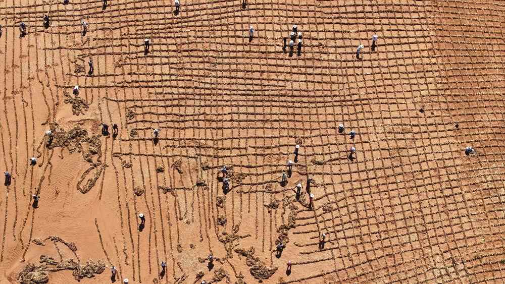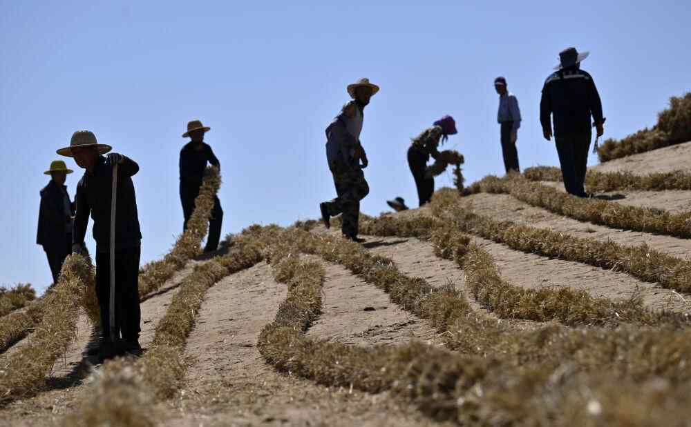 在宁夏中卫市沙坡头区长流水村,烈日炎炎,沙海热浪滚滚,大型植保无人机在轰鸣声中起飞,将一捆捆干草吊运至沙丘之上,200多名工人正在抓紧扎草方格。随着最后一列草方格稳稳扎进沙子,腾格里沙漠宁夏境内,镶上一条长约153公里、最宽处达38公里“绿链”锁边。