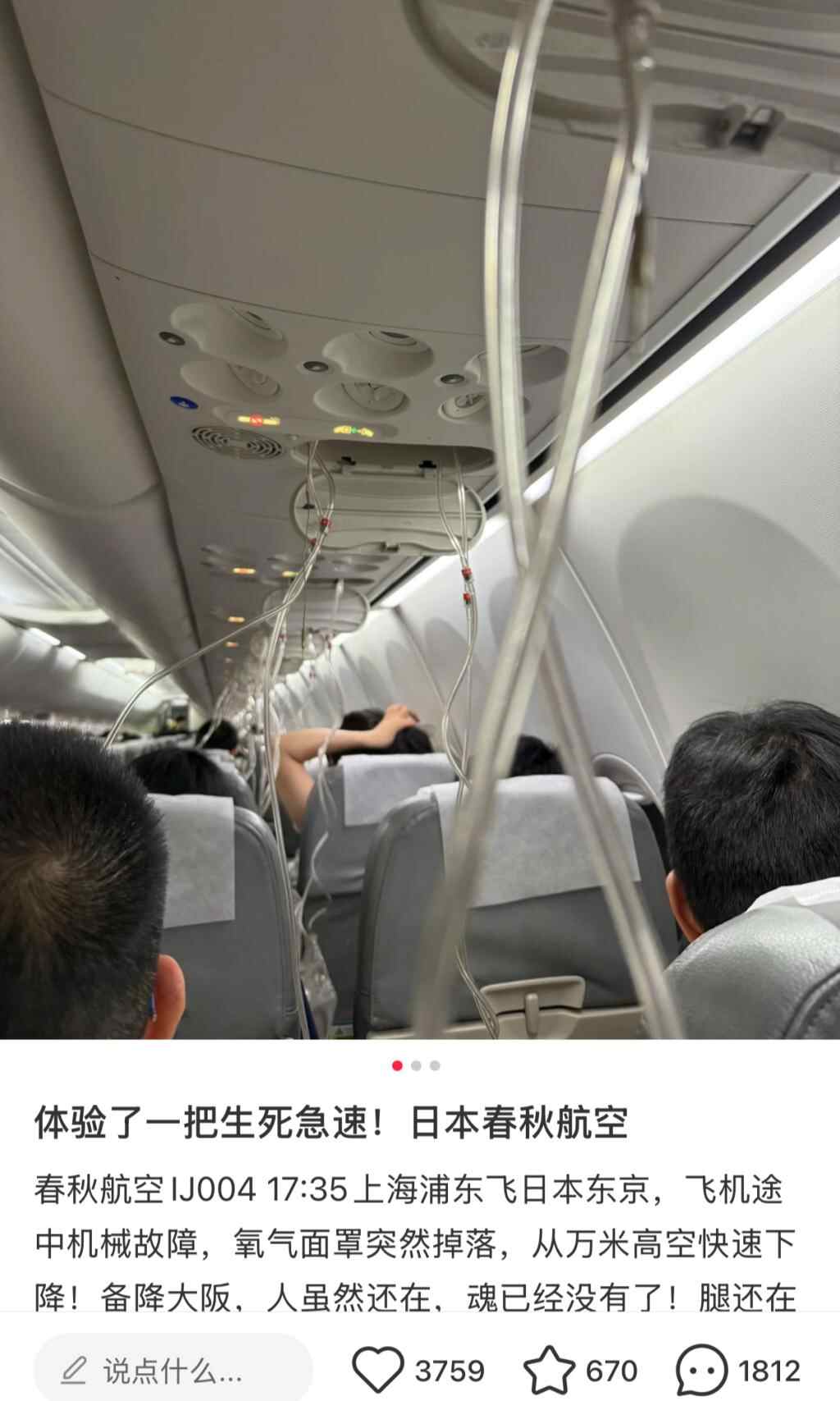 6月30日,多名网友发帖讲述了当天从上海飞往日本东京的春秋日本IJ004航班“紧急备降”的经历,其间氧气面罩掉落,飞机急速下降,过程十分惊险。