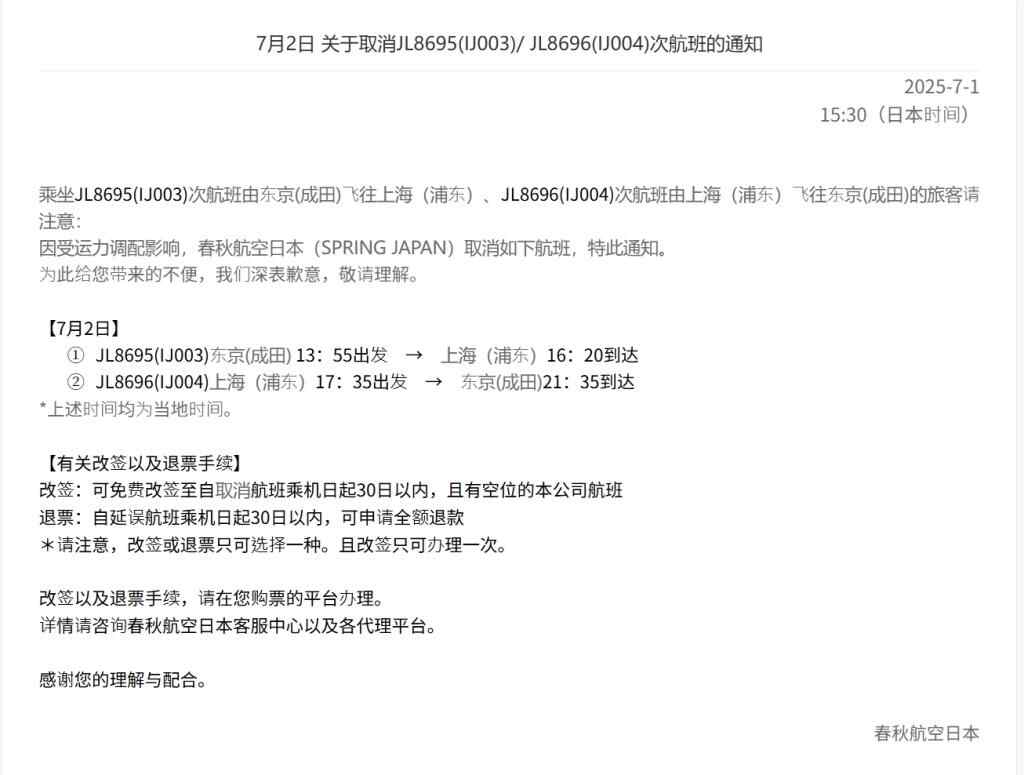 记者注意到,取消的航班包括7月1日与7月2日JL8695(IJ003)次航班由东京(成田) 飞往上海(浦东)、JL8696(IJ004)航班由上海(浦东)飞往东京(成田)等,取消原因均是“因受运力调配影响”。通知落款为“春秋航空日本。”