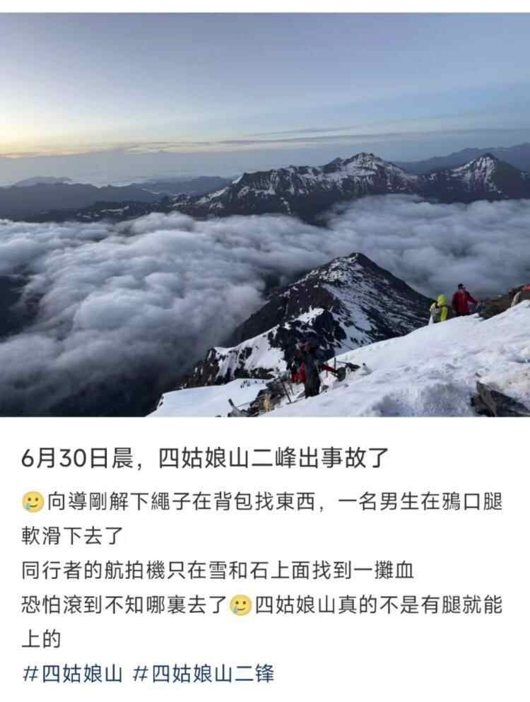 事情发生在6月30日,多个网帖披露了此事,有网友称,“向导刚解下绳子在背包里找东西,一名男生就在垭口腿软滑下去了”“登山杖都还在雪里插着,眼睁睁看着(男生)滑下去的”。相关帖子迅速引发网民关注,评论已有3000多条。“垭口这里站两分钟都怕”“我也去过二峰,边滑边爬,下山也一直摔,真的好危险”“据说找到了,人已经没了”……