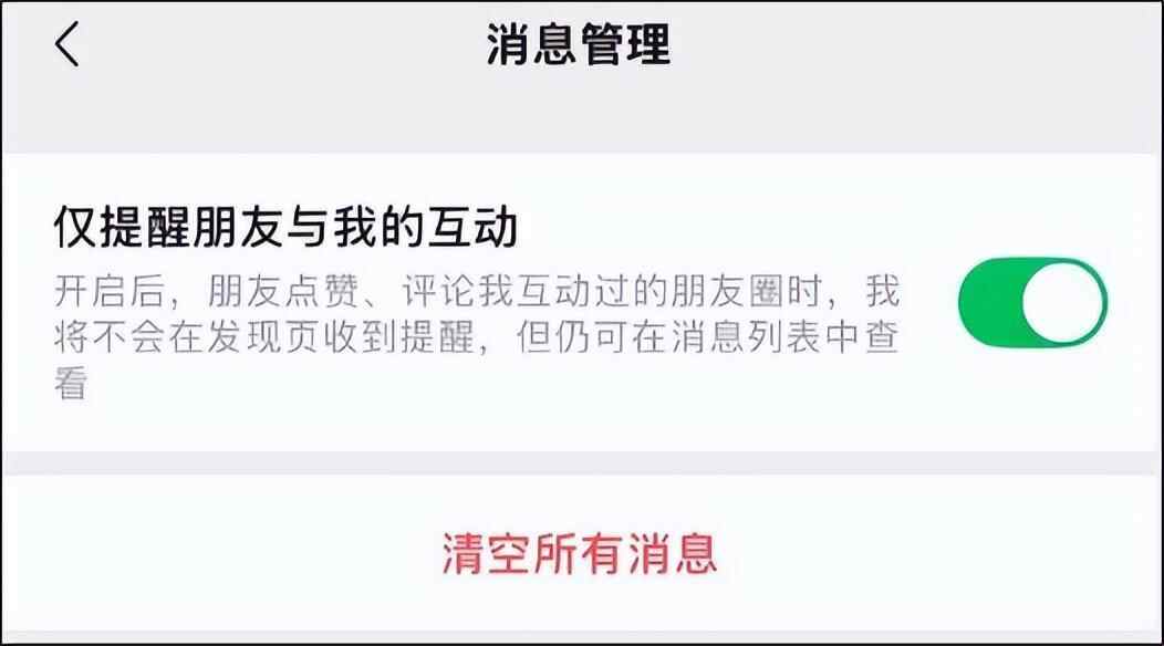 开启路径:将微信更新至最新版本后,进入【我】—【朋友圈—【我的朋友圈】— 右上角【…】—【消息列表】—再次点击右上角【…】进入【消息管理】,此时多了一个“仅提醒朋友与我的互动”设置页面。