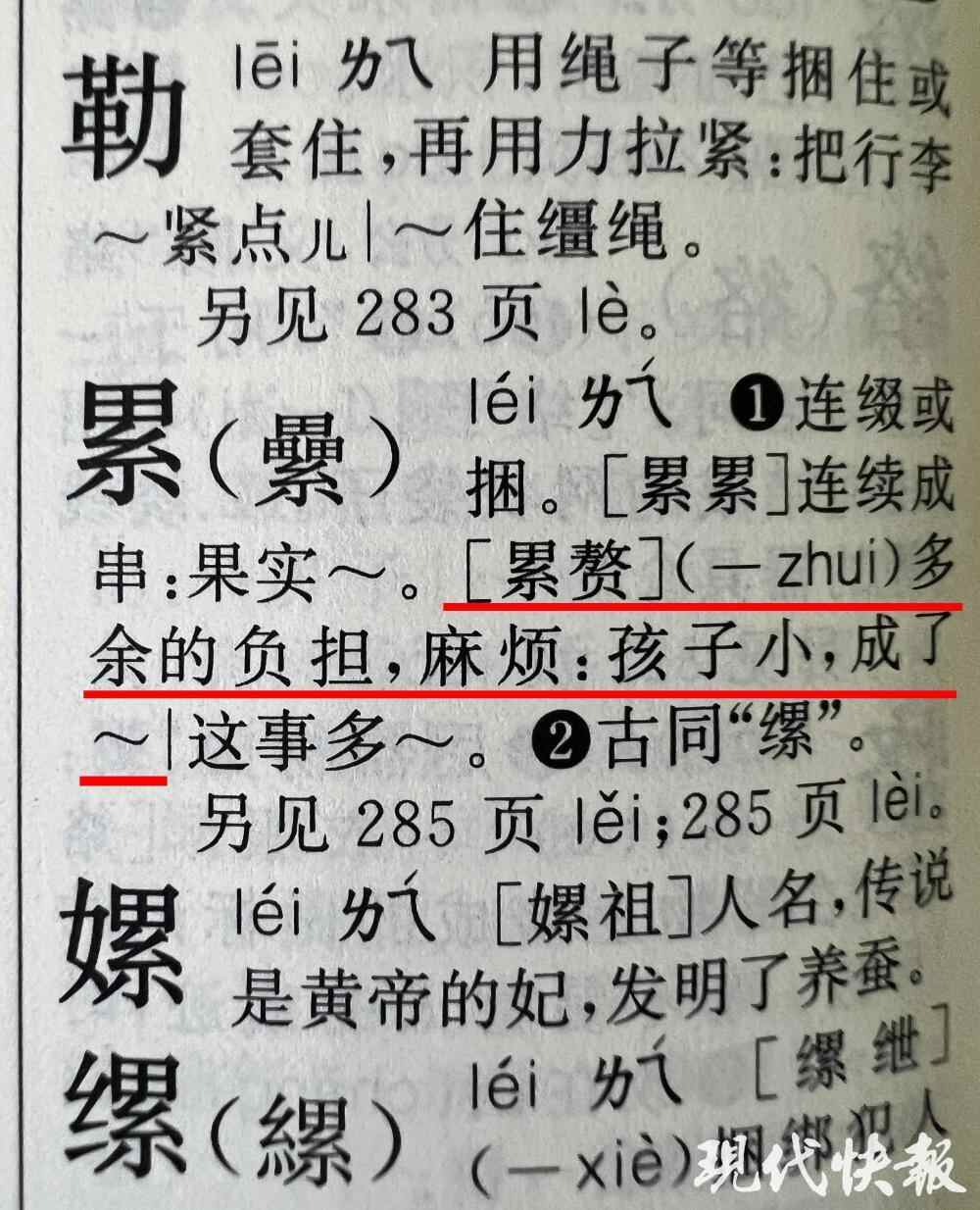 据读者介绍,“孩子小,成了累赘”这句话,出自第12版新华字典。其中,在介绍“累”读“léi”的时候,组词中包括“累赘”,释义为多余的负担,麻烦,造句“孩子小,成了累赘”“这事多累赘”。