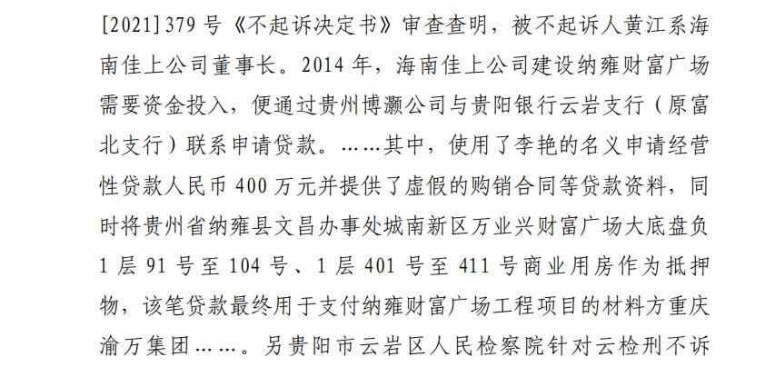 海南佳上公司证实,王庆琼为解决其实际控制的贵州博灏公司的不良贷款,以为海南佳上公司旗下项目提供贷款及10亿元授信为由,要求海南佳上公司提供员工、个体工商、公司等作为贷款主体。但被起诉的贷款人之一李艳称自己从没见过一分钱。