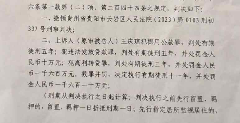 就在李艳案一审判决半个月前,贵阳市云岩区人民法院一审判决王庆琼犯挪用公款罪、违法发放贷款罪、高利转贷罪。半年后,2024年11月8日,贵阳市中级人民法院对王庆琼案作出终审判决,认定其犯挪用公款罪、违法发放贷款罪、高利转贷罪,数罪并罚决定执行有期徒刑11年。经审计,其中王庆琼违法发放博灏系列贷款268笔,共计9.9亿元,其中就包括李艳的这笔贷款。