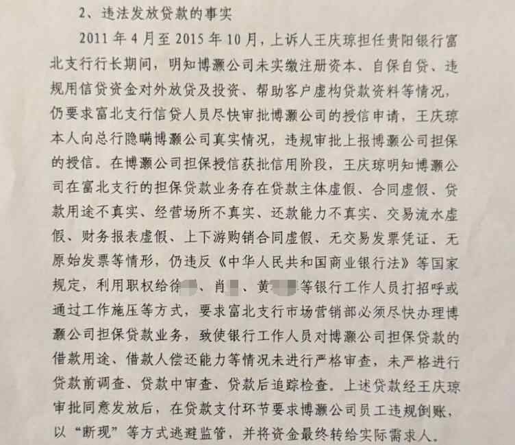 记者获取的王庆琼违法放贷案终审《刑事判决书》显示,法院认定,2011年4月至2015年10月,王庆琼担任贵阳银行富北支行行长期间,明知贵州博灏公司未实缴注册资本、自己为实际控制人、贵州博灏公司自保自贷、违规用信贷资金对外放贷及投资、帮助客户虚构贷款资料等情况,仍要求富北支行信贷人员尽快审批博灏公司的授信申请,王庆琼本人向总行隐瞒博灏公司真实情况,违规审批上报贵州博灏公司担保的授信申请。