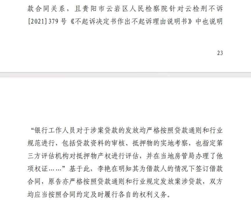 法院称,至于该款项后续实际用途是什么,并不影响原告与被告李艳之间成立借款合同关系,且云岩区人民检察院针对上述《不起诉决定书》也说明“银行工作人员对于涉案贷款的发放均严格按照贷款通则和行业规范进行,包括贷款资料的审核、抵押物的实地考察,也指定第三方评估机构对抵押物产权进行评估,并在当地房管局办理了他项权证……”基于此,李艳在明知其为借款人的情况下签订借款合同,原告亦严格按照贷款通则和行业规定发放案涉贷款,双方均应当按照合同约定及时履行各自的权利义务。