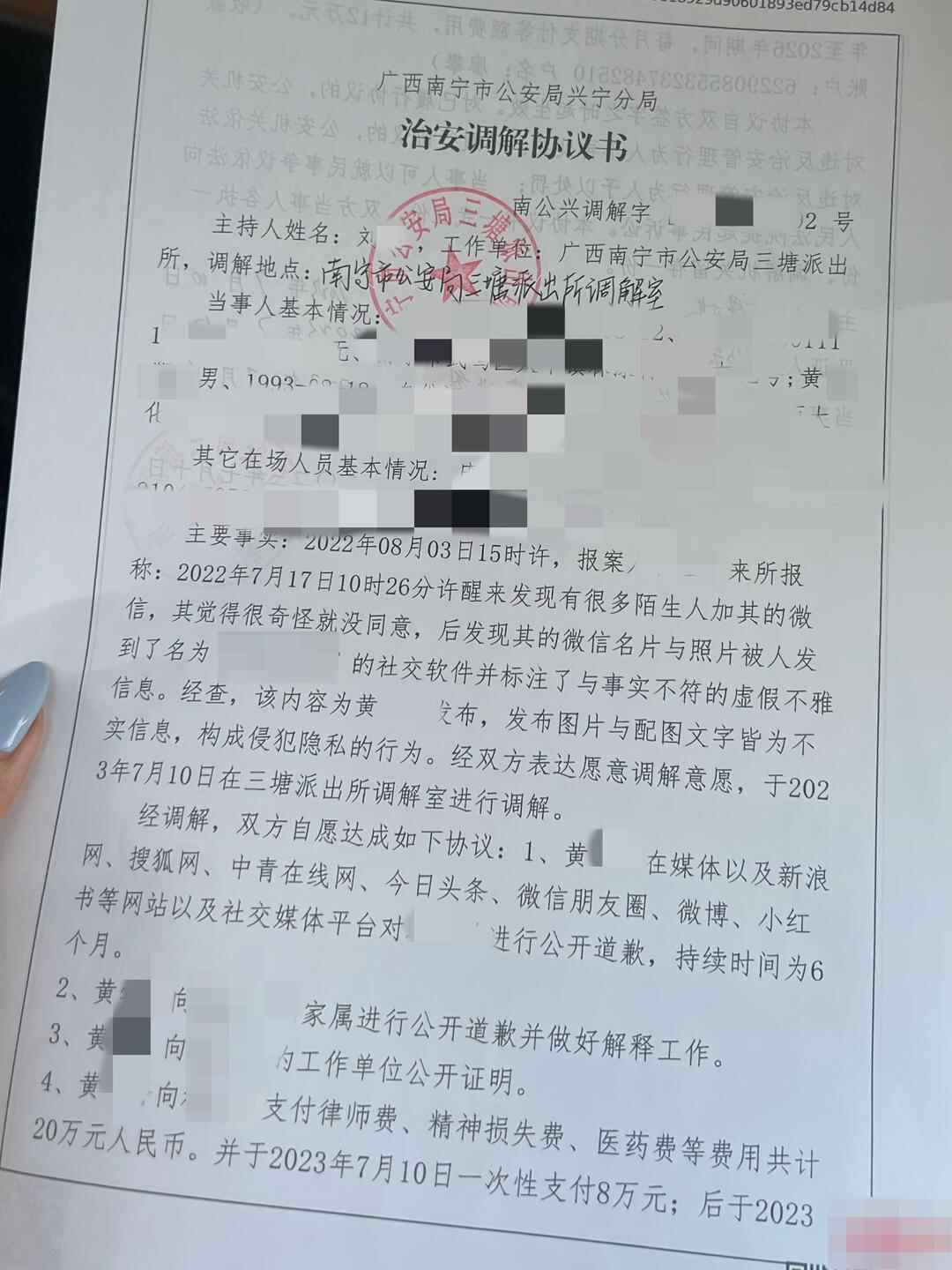 2023年7月10日,黄某和吴女士以及吴女士聘请的律师在南宁市公安局三塘派出所内调解。吴女士一方提出,黄某造谣的行为致使她和家人都受到负面影响,她患上了严重的抑郁症,因此无法工作。当时,黄某在派出所签下《治安调解协议书》,愿公开向吴女士及其家属道歉并赔偿20万元。可离开派出所后,黄某却未按期履约。