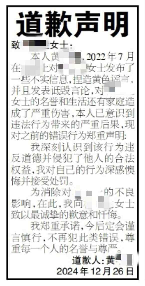 2024年12月26日,黄某在报纸上发布道歉声明,承认自己在社交平台上对吴女士发布了一些不实信息,捏造黄色谣言,并且发表诋毁言论,对吴女士的名誉和生活还有家庭造成了严重伤害,黄某已意识到违法行为带来的严重后果,深刻认识到该行为违反道德并侵犯了他人的合法权益,黄某对自己的行为深感懊悔并接受处罚,并向吴女士致歉。