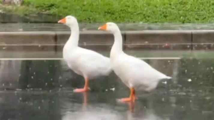 群鹅雨中“石化”超呆萌,防水羽毛竟是“淡定秘诀”