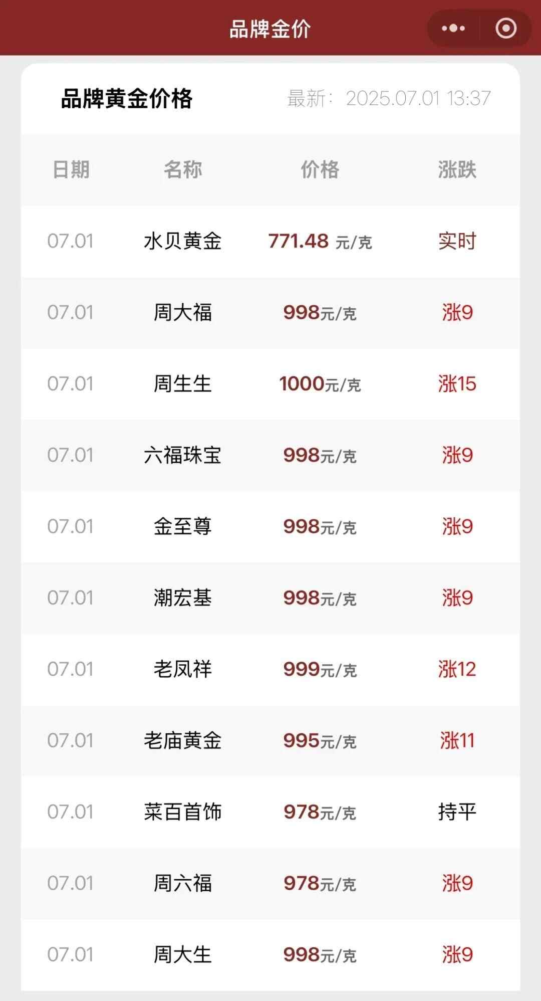受此影响,国内黄金品牌价格随之攀升,克价纷纷涨至千元左右。
