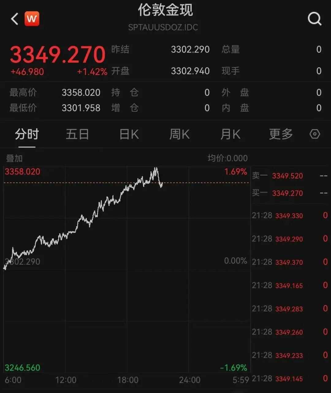 7月1日,国际金价出现转涨行情。据Wind数据,截至发稿,现货黄金涨1.43%,报3349.38美元/盎司。