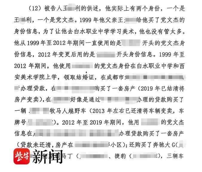 王某利供述,他实际上有两个身份,一个是王某利,一个是党文杰。1999年,他父亲王某某给他买了党文杰的身份信息,为了让他去白水职业中学学习美术,他也没有管太多。1999年至2012年,他用党文杰的身份信息在白水职业中学和西安美术学院上学,领取结婚证,在成都贷款买了一套房、一辆牧马人越野车。2012年至2019年,他用党文杰身份信息在成都贷款买了一套房,还买了奔驰大G、阿斯顿马丁、捷豹共3辆车,另外还注册了几家公司。