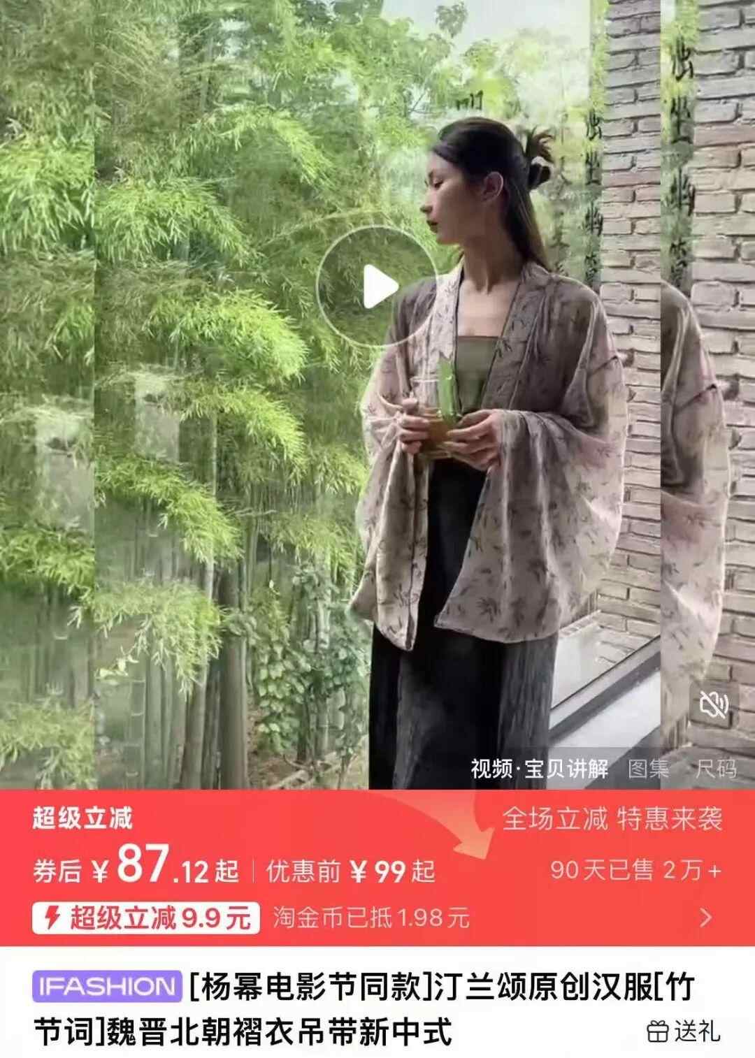 记者搜索店铺页面显示,该款汉服已经标上“杨幂电影节同款”的标签,杨幂所穿的褶衣标价168元,券后148.02元。