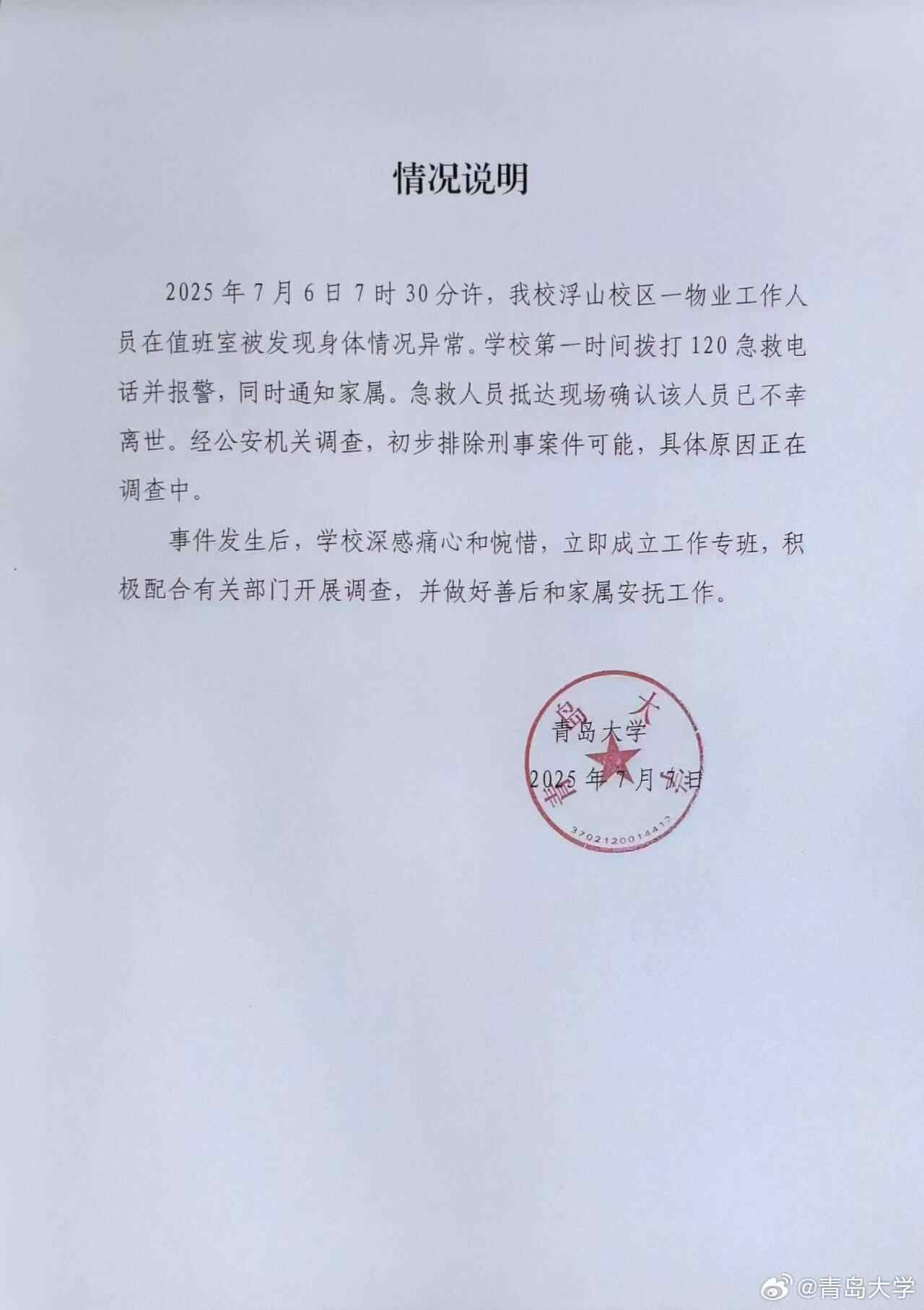 7月7日凌晨,青岛大学发布情况说明称,7月6日7时30分许,该校浮山校区一物业工作人员在值班室被发现身体情况异常。学校第一时间拨打120急救电话并报警,同时通知家属。急救人员抵达现场确认该人员已不幸离世。经公安机关调查,初步排除刑事案件可能,具体原因正在调查中。