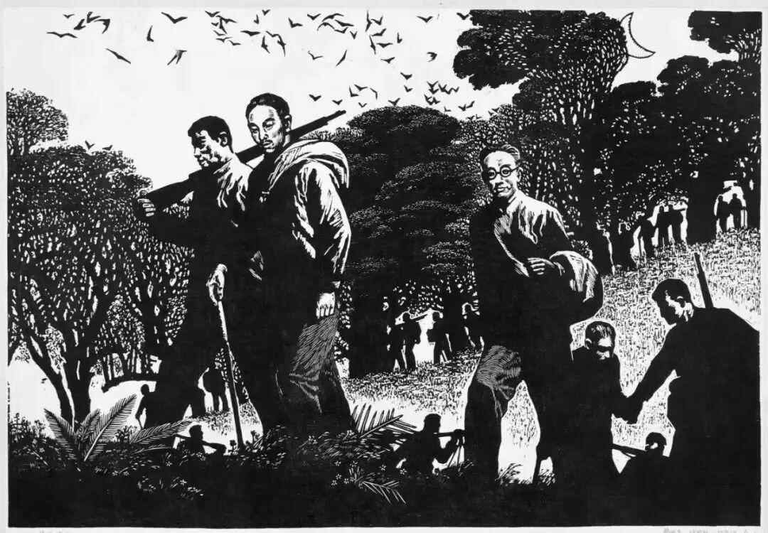 “这张画能够留得住,我觉得构思起了关键的作用。”许钦松表示。画面运用留白表现夜空,单线轮廓勾勒出一弯月亮,与前景中主要人物侧脸和肩背的留白相呼应,更与题目“晓风残月”共同形成了诗意的表达。“我们希望以此为历史事件、艺术表达突出提炼革命乐观主义的精神——长夜终尽,黎明将至。”