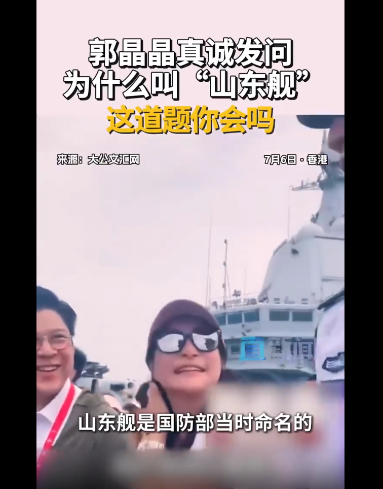 7月6日,霍启刚郭晶晶夫妇来到山东舰参观,在山东舰甲板上参观的过程中,郭晶晶还提出了自己的疑问,“为什么叫山东舰?”