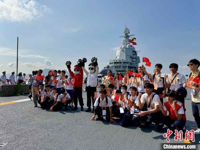 7月4日,山东舰举行开放参观活动。据了解,由中国人民解放军海军航空母舰山东舰,导弹驱逐舰延安舰、湛江舰及导弹护卫舰运城舰组成的航母编队抵达香港,开启为期5天的访问活动。图为香港青少年和山东舰官兵装扮的“大熊猫”合影。 中新社记者 戴梦岚 摄