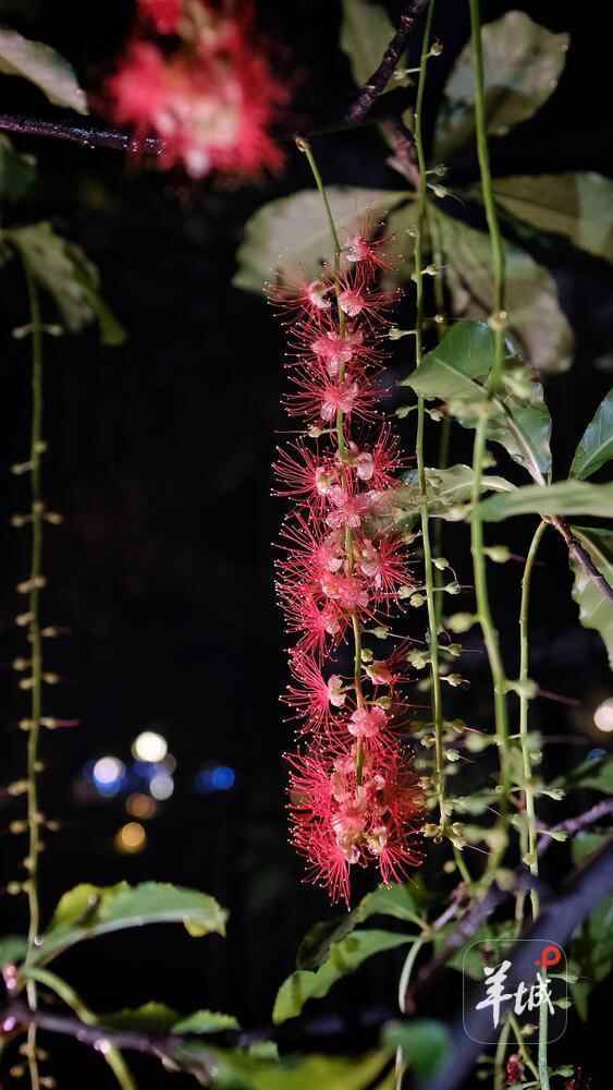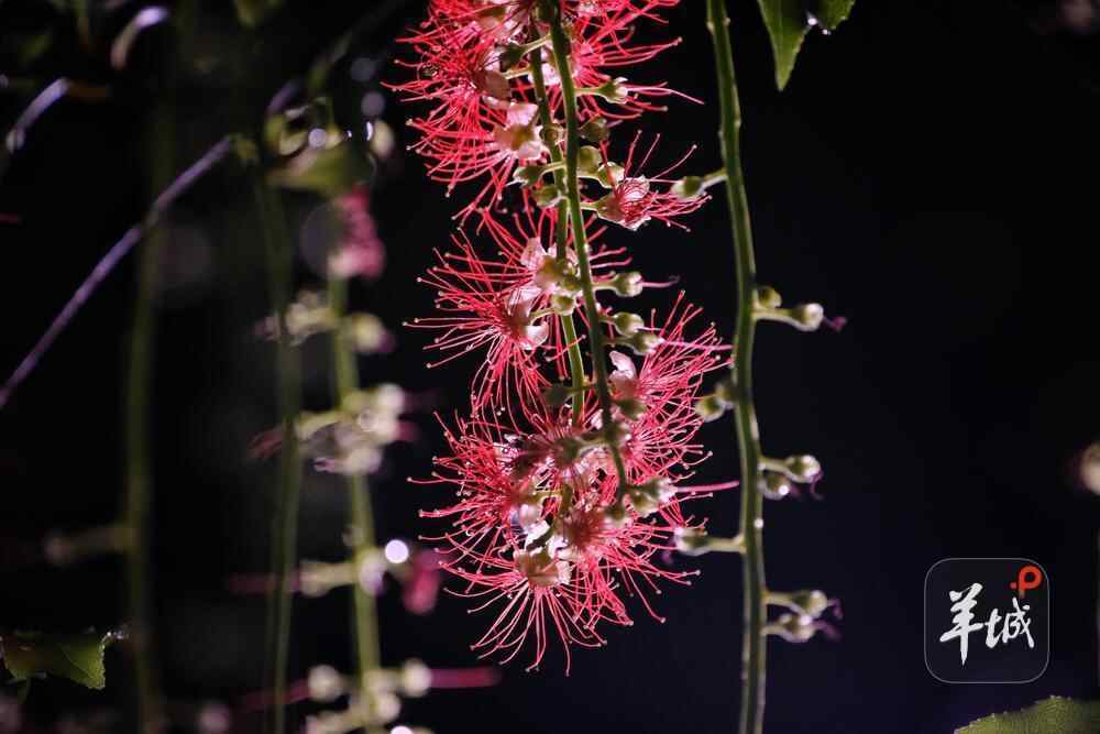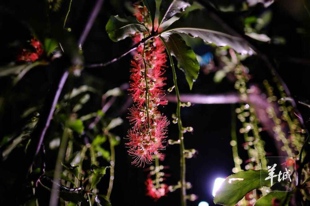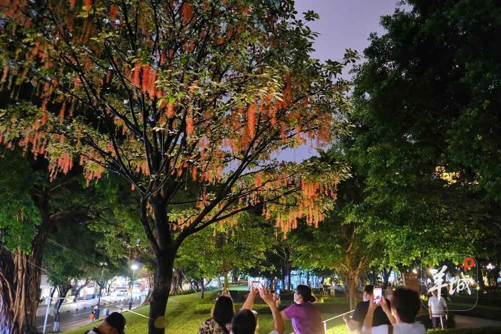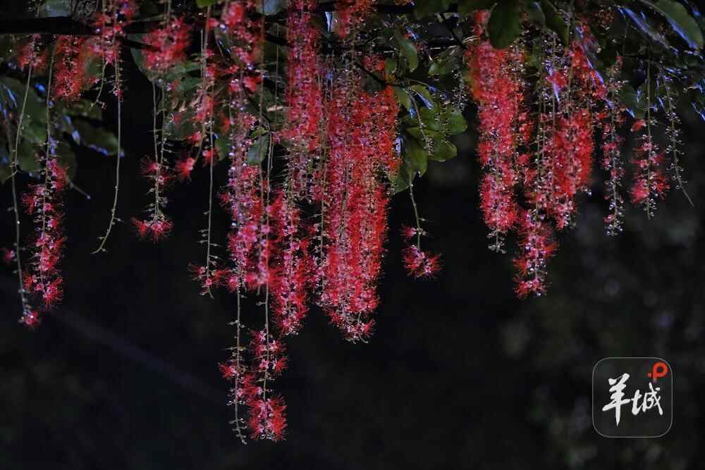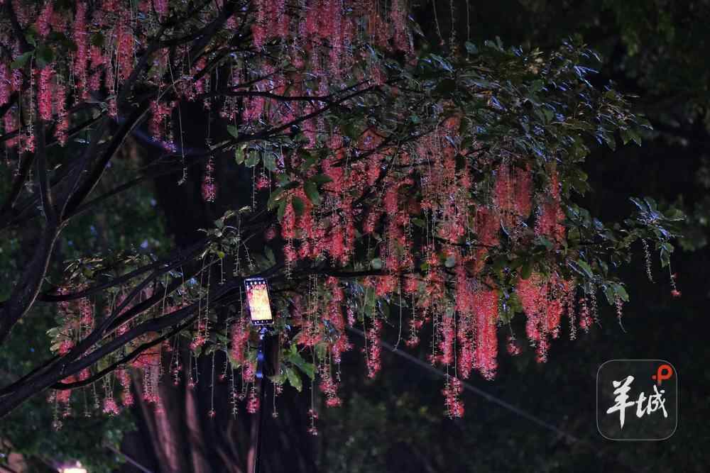 7月6日晚,雨后羊城格外清新,在人民公园,夜幕下,一串串艳红花朵垂挂枝头,清香袭人,成为夏夜羊城一道浪漫的风景线。