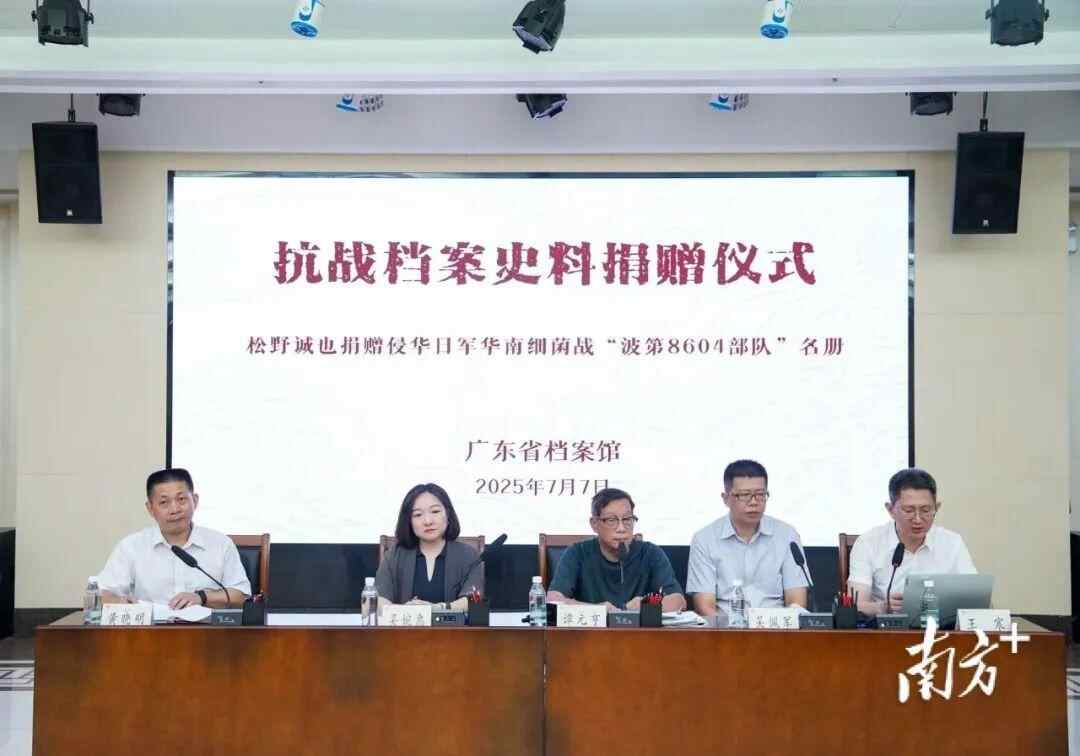 7月7日,七七事变八十八周年纪念日当天,广东省档案馆举行“抗战档案史料捐赠仪式”,接收了日本学者松野城也教授捐赠的“波第8604部队”名册。