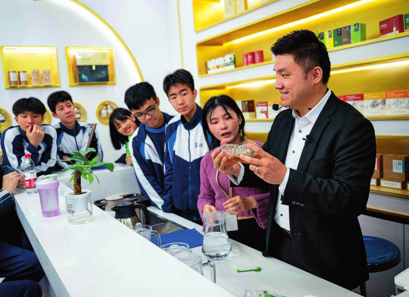 澳门居民黄滋才(右一)在位于横琴的分子态(珠海横琴) 中医药健康产业发展有限公司的植物(现代中药)分子博物馆内 与澳门劳校中学的学生交流(2024 年 12 月 11 日摄) 新华社发(张金加摄)