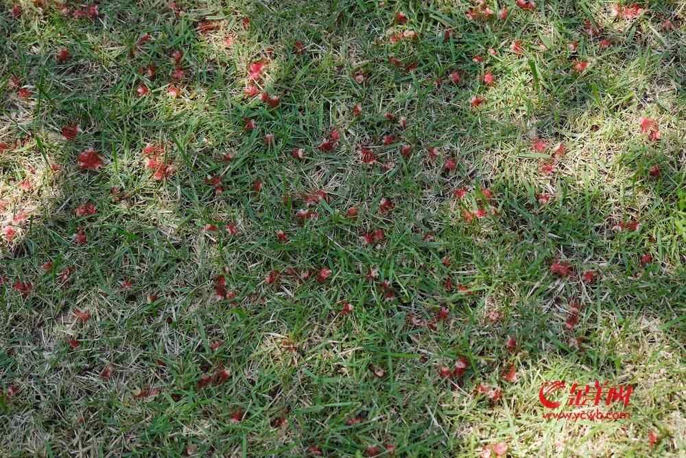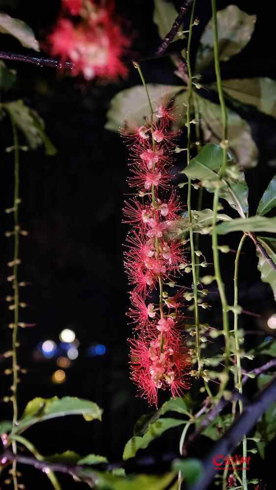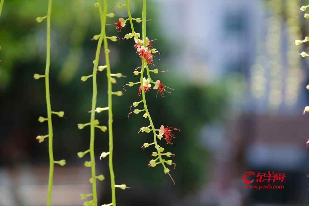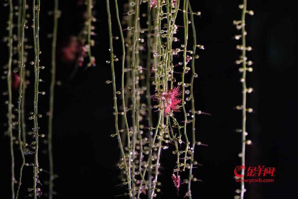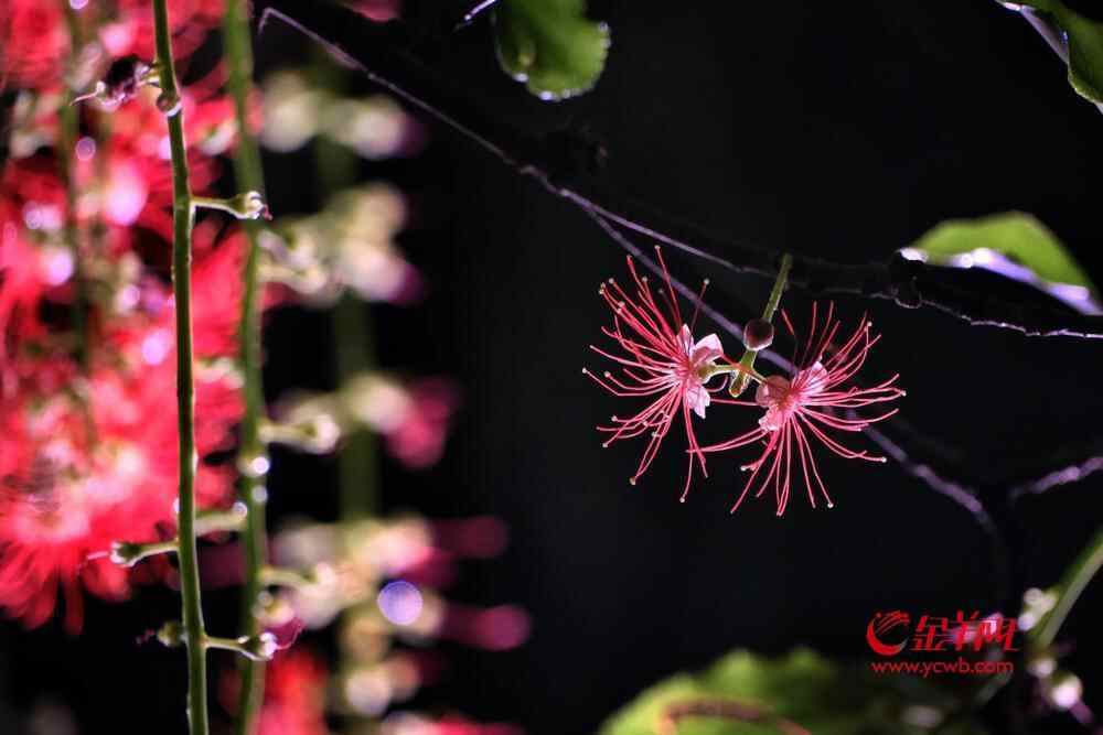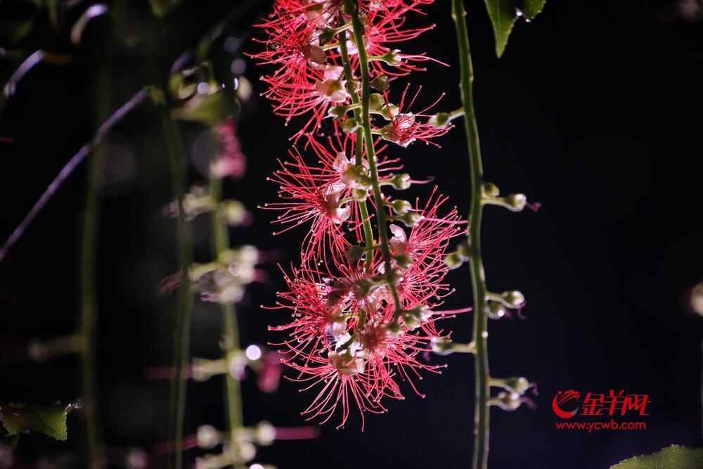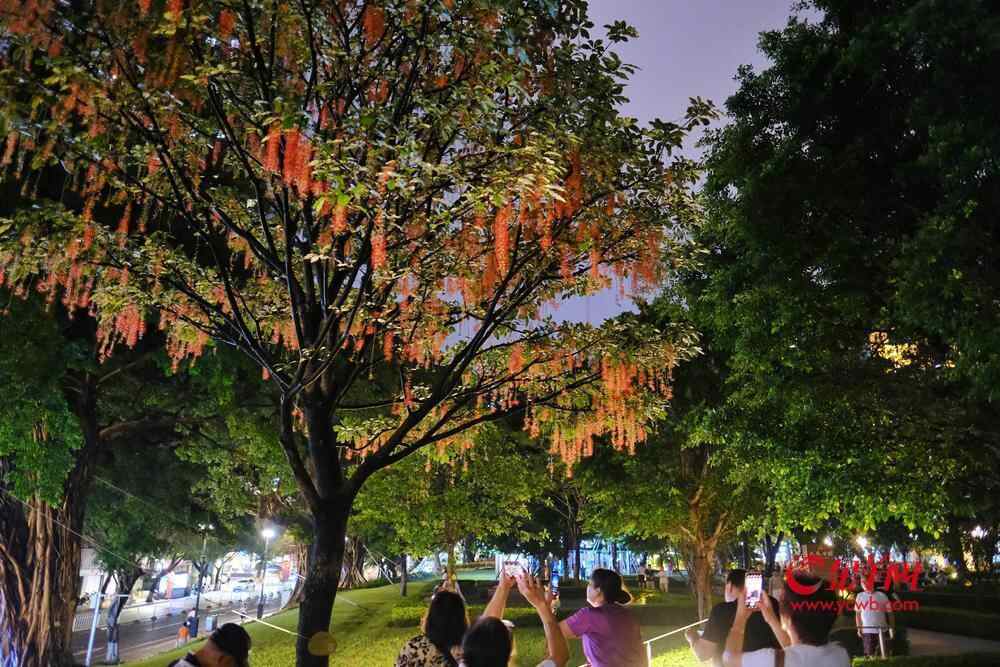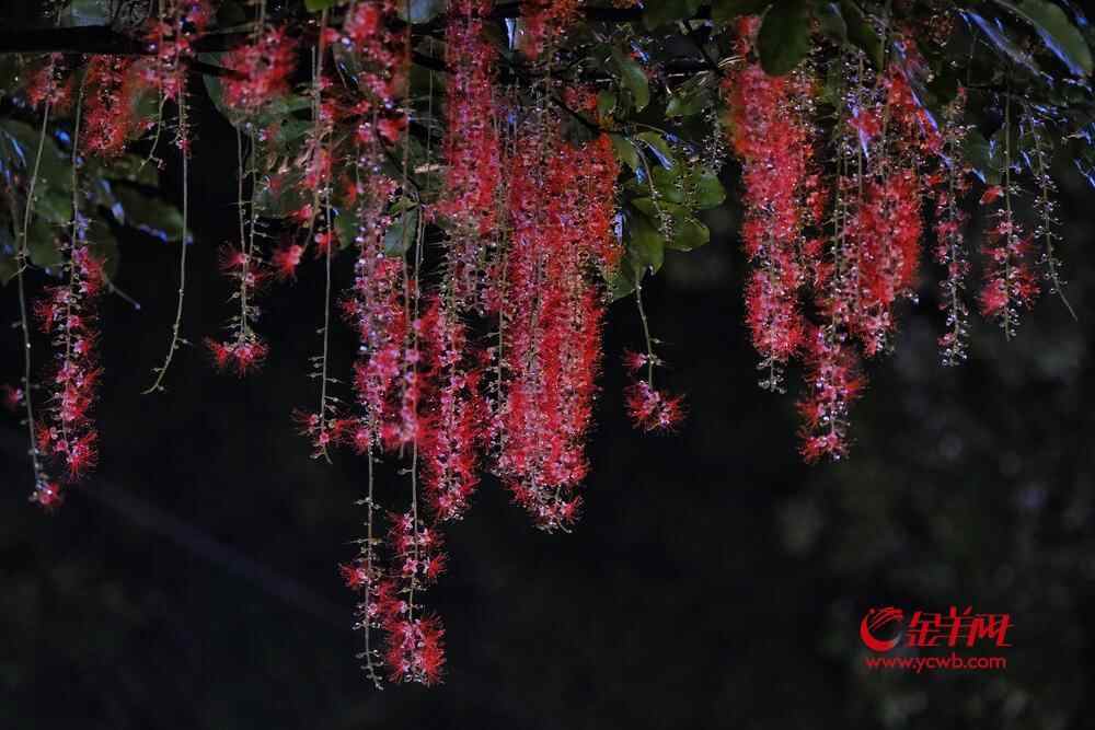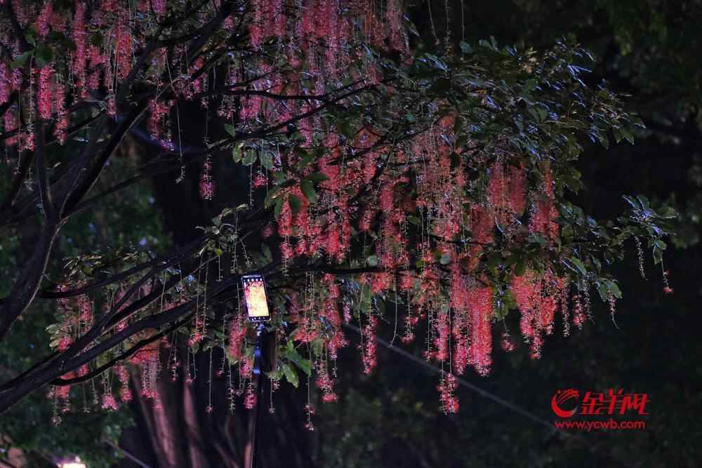 7月6日晚,雨后羊城格外清新,在人民公园,夜幕下,一串串艳红花朵垂挂枝头,清香袭人,成为夏夜羊城一道浪漫的风景线。