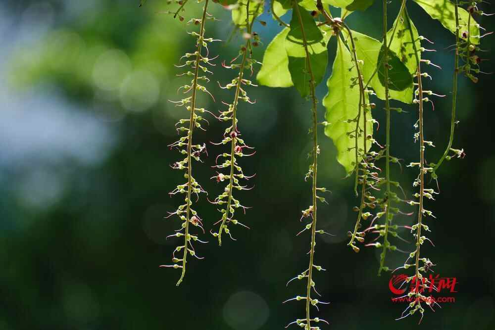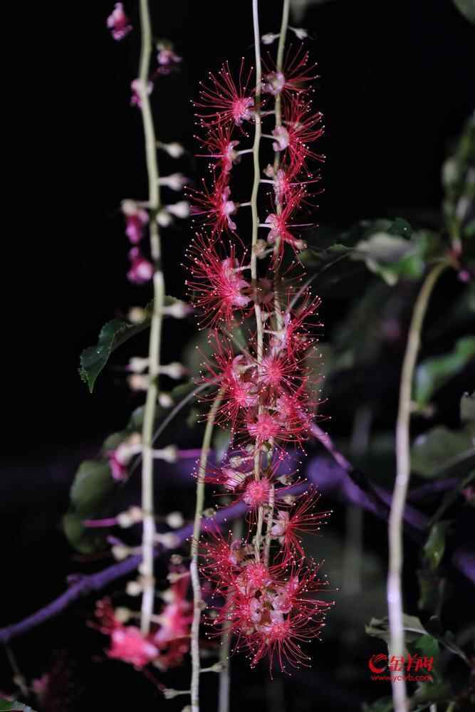 据了解,红花玉蕊为玉蕊科常绿乔木,广布非洲、亚洲和大洋洲的热带、亚热带地区,因其花朵多在傍晚至次日清晨绽放,生命短暂而灿烂,故有“夜仙子”之称,又被称为“月下美人”。其花序细长下垂,花瓣呈丝状,花色由粉红至深红,极具观赏价值。最奇特的是,红花玉蕊单朵花仅开放一夜,翌晨即凋谢。