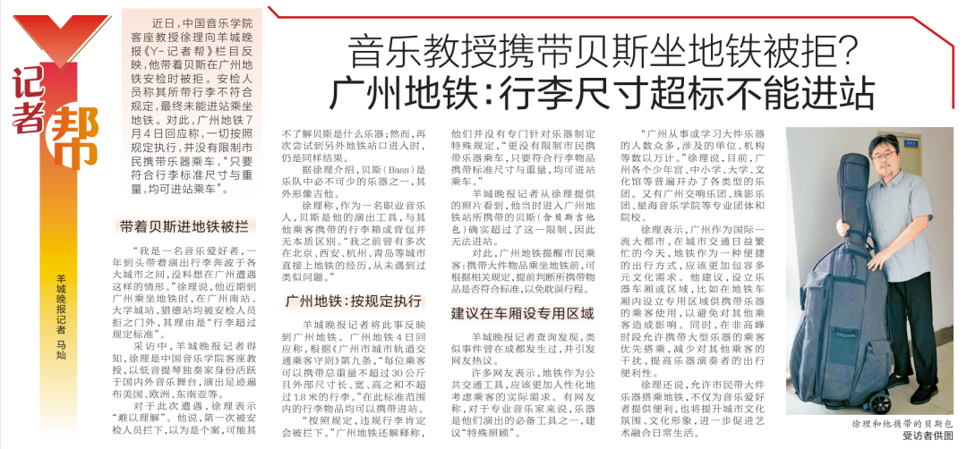 近日,中国音乐学院客座教授徐理向羊城晚报《Y-记者帮》栏目反映,他带着贝斯在广州地铁安检时被拒。安检人员称其所带行李不符合规定,最终未能进站乘坐地铁。对此,广州地铁7月4日回应称,一切按照规定执行,并没有限制市民携带乐器乘车,“只要符合行李标准尺寸与重量,均可进站乘车”。