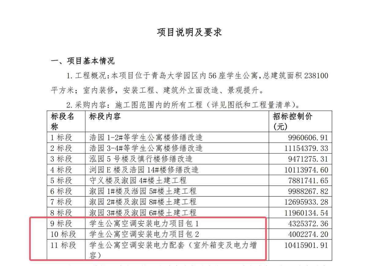 在今年5月底及6月底,青岛大学先后发布学生公寓维修改造项目招标公告、学生公寓维修改造项目(1676)竞争性磋商公告,上述内容均提及学生公寓空调安装电力项目和学生公寓空调安装电力配套(室外箱变及电力增容)。