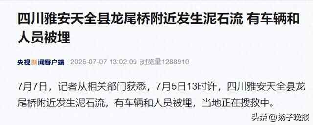 此前据央视新闻,7月7日,记者从相关部门获悉,7月5日13时许,四川雅安天全县龙尾桥附近发生泥石流,有车辆和人员被埋,当地正在搜救中。