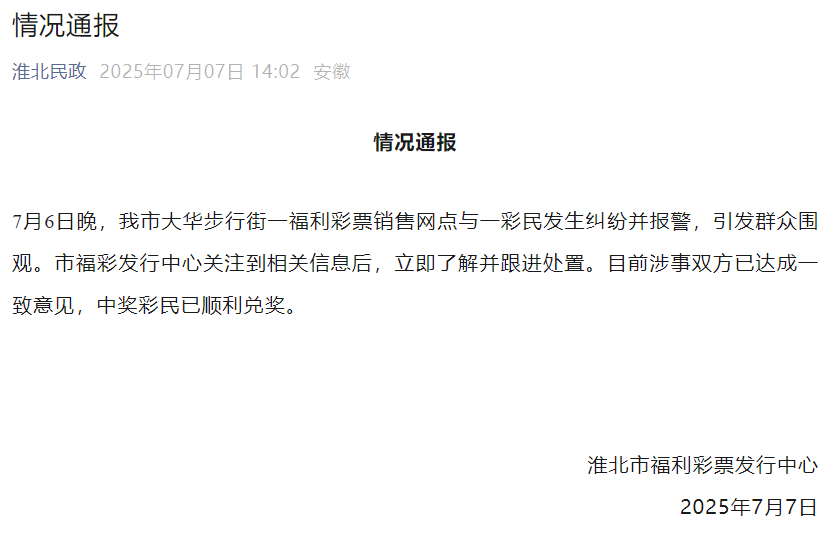 7日下午,淮北市福利彩票发行中心发布情况通报:7月6日晚,我市大华步行街一福利彩票销售网点与一彩民发生纠纷并报警,引发群众围观。市福彩发行中心关注到相关信息后,立即了解并跟进处置。目前涉事双方已达成一致意见,中奖彩民已顺利兑奖。