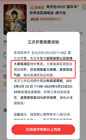 其购前须知明确提到,大屏观演区因控台遮挡视野,仅支持观看大屏幕、感受现场气氛。同时,此次不再设退票期,所有订单均不支持退票。