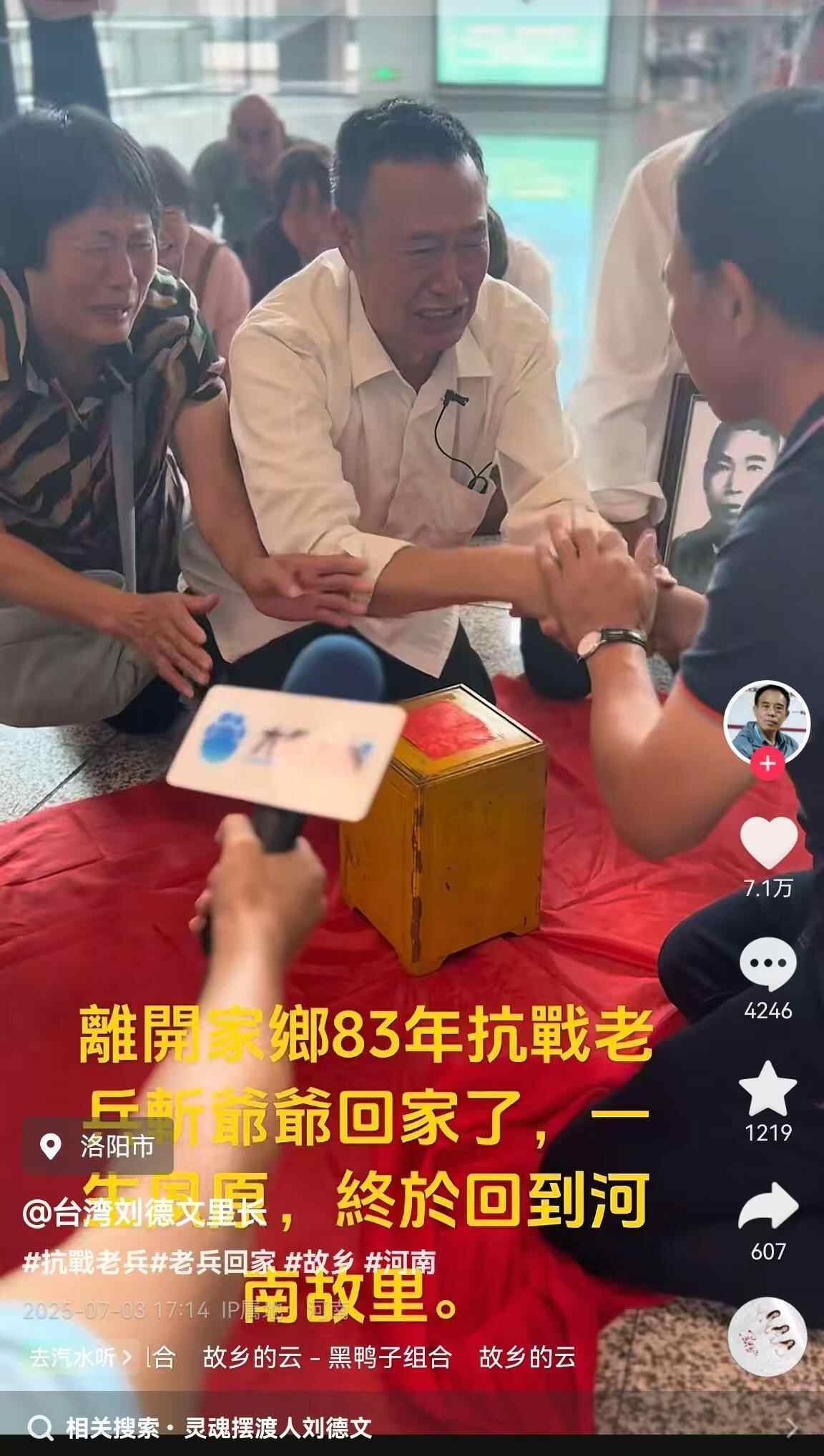 此前,7月2日,刘德文送老兵靳致钦的骨灰回河南。靳致钦1925年生于河南新郑,曾参与抗日战争,1948年到台湾。此后一直独自生活,直到1970年去世。此前,靳致钦的大侄子靳书民让儿子在网上联系上刘德文,刘德文四处奔波寻找骨灰、办理相关手续,不足半年,这份萦绕在几代人心头的心愿终于完成。