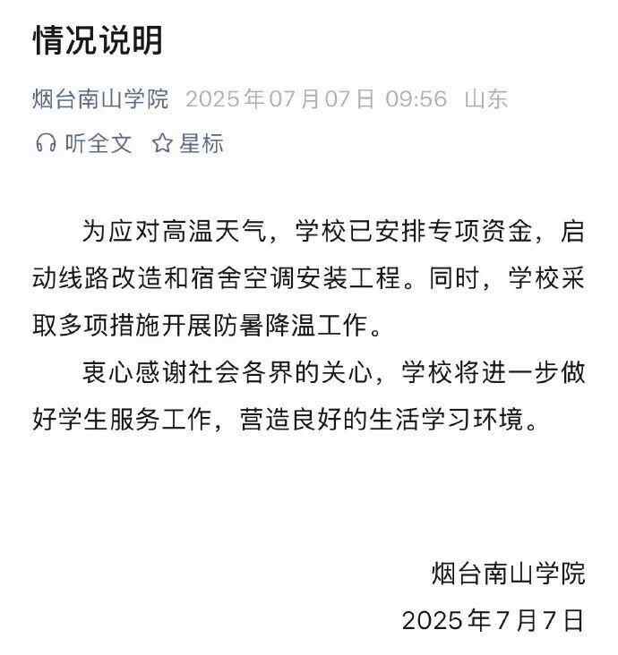 7月7日上午,@烟台南山学院 发布最新情况通报:为应对高温天气,学校已安排专项资金,启动线路改造和宿舍空调安装工程。同时,学校采取多项措施开展防暑降温工作。衷心感谢社会各界的关心,学校将进一步做好学生服务工作,营造良好的生活学习环境。