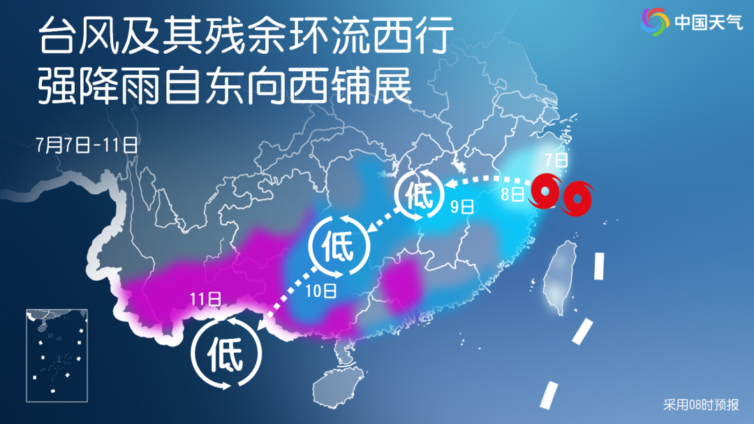 二次登陆后,“丹娜丝”会西行并减弱,减弱后的低压环流或深入内陆,与季风气流、其东侧的低压环流联手制造大范围降雨。9日开始,江南南部、华南以及西南不少地方会陆续出现中到大雨,局地暴雨,影响波及江西、湖南、广东、广西、贵州、云南等6省区。