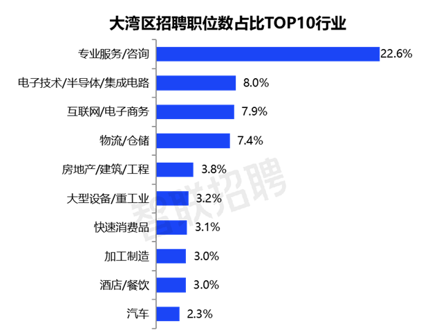 数据显示,今年以来大湾区招聘需求中,重点产业占比较高。专业服务/咨询(财会/法律/人力资源等)以22.6%的占比位居首位;电子技术/半导体/集成电路、互联网/电子商务的占比相近,分别为8.0%、7.9%,凸显大湾区在科技创新、数字经济等战略性新兴领域的产业优势;大型设备/重工业、加工制造、汽车等合计占比约为8.5%,集中体现大湾区“先进制造业立区”的战略导向。