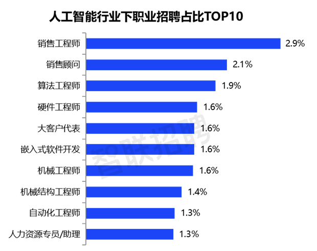 在人工智能行业中,销售工程师(2.9%)、销售顾问(2.1%)、大客户代表(1.6%)等业务拓展岗招聘职位数占比较高。同时,硬件工程师、嵌入式软件开发、机械工程师招聘占比均为1.6%,且算法工程师招聘薪资高达24799元,凸显其在领域内的关键技术地位。