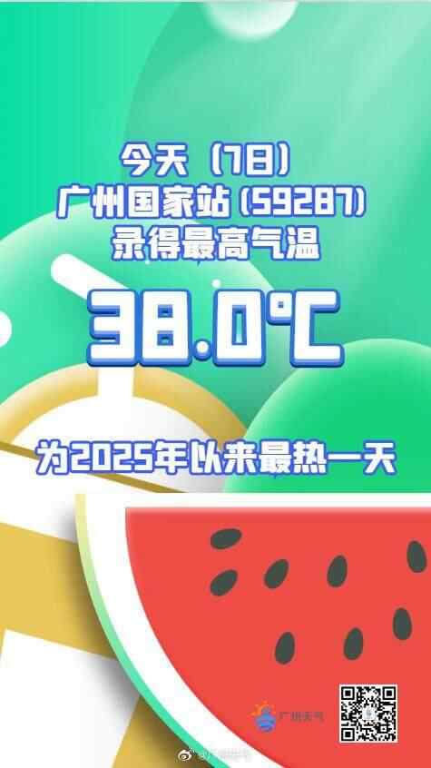 蕉岭国家基本气象站以38.5℃的高温,成为7月7日广东国家基本气象站当中的最高气温。广州市气象部门7月7日表示,广州国家基本气象站在当天录得38℃高温,为今年以来该站的最高气温。截至7月7日17时40分,如果把非国家级气象站也纳入统计,则越秀、增城、海珠、白云、从化、荔湾等区,均有自动气象站录得超过40℃的高温,其中越秀区建设街黄华路自动气象站,录得广州非国家级气象站当中的最高气温41.6℃。
