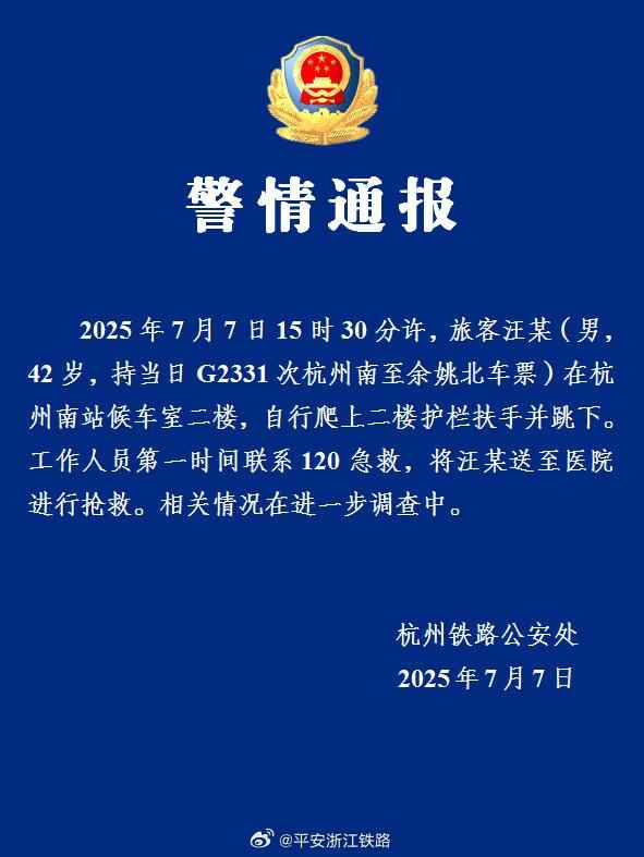 7月7日,@平安浙江铁路 发布通报称,7月7日15时30分许,旅客汪某(男,42岁,持当日G2331次杭州南至余姚北车票)在杭州南站候车室二楼商业区,自行爬上二楼护栏扶手并跳下。工作人员第一时间联系120急救,将汪某送至医院进行抢救。相关情况在进一步调查中。