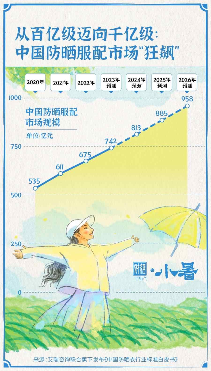 随着人们防晒意识的提升,以及露营、骑行等户外运动场景的火热加持,中国防晒服配市场规模近5年呈现稳健增长的态势,艾瑞咨询报告预测,2026年国内防晒服配市场规模将达到958亿元,接近千亿级市场,其中防晒衣占比将达554亿元,超过50%。