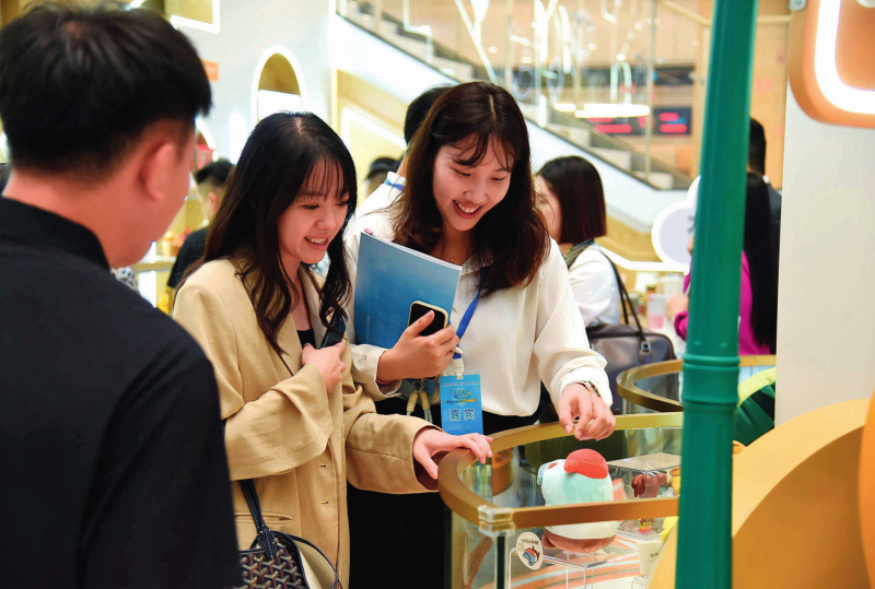 港澳青年在横琴政务服务中心的“澳品荟”横琴展示区浏览 澳门创意产品(2024 年 9 月 23 日摄) 洪泽华摄 / 本刊